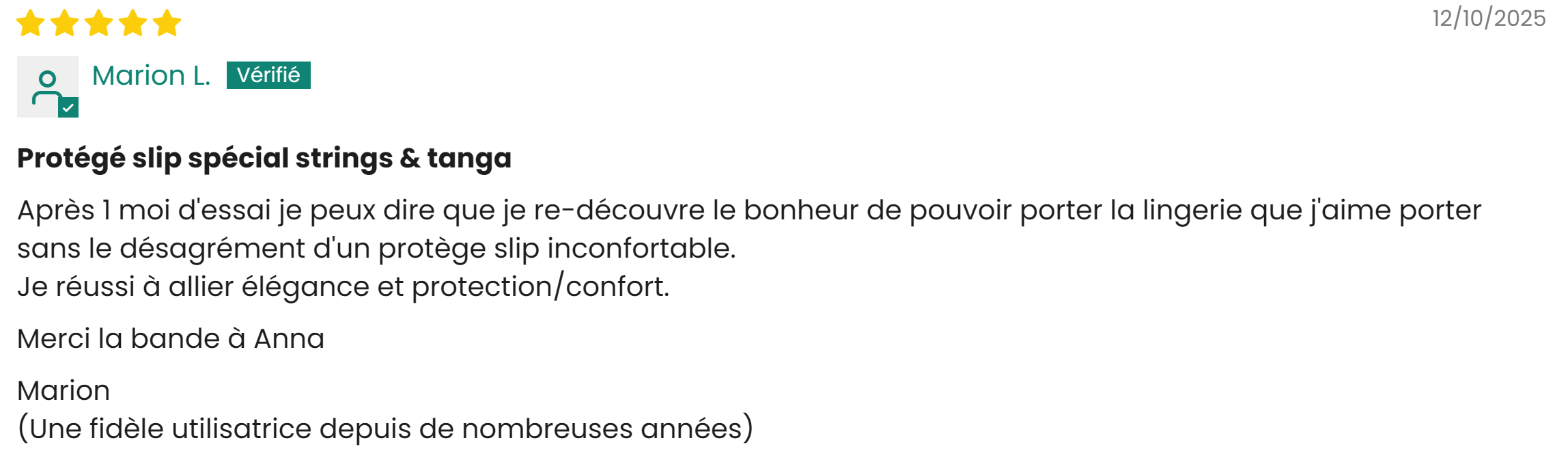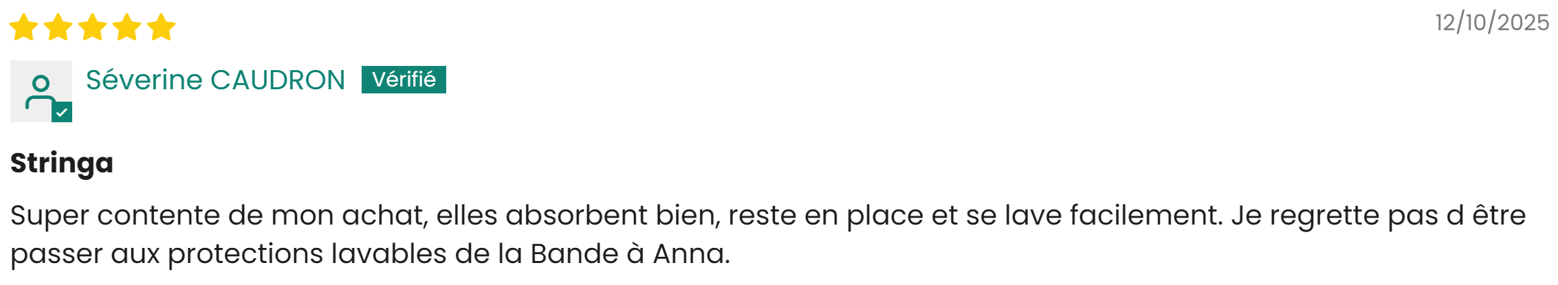 Depuis nos débuts, La Bande à Anna continue d’évoluer et c'est grâce à vous. Chaque retour, chaque avis sur nos protections lavables compte vraiment. Nous lisons tout, et nous améliorons sans cesse nos modèles en fonction de vos retours. Certaines de nos testeuses ont, par exemple, souligné un léger souci de maintien du Stringa sur des modèles de strings ou tangas.