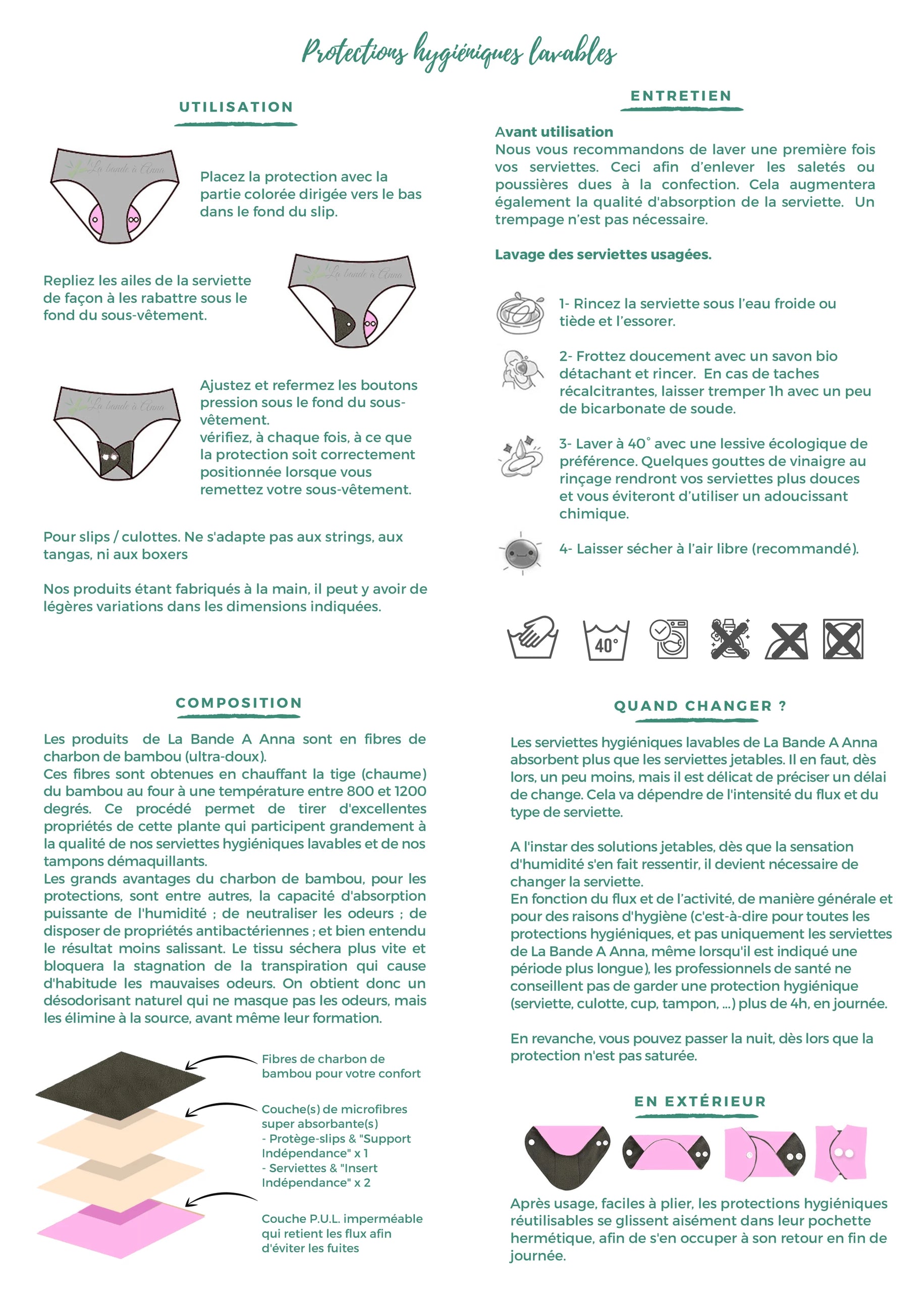 Nous recommandons delaver une première foisvos protections réutilisablesavant utilisationpour enlever les saletés ou les poussières dues à la confection. Cela augmentera également la qualité d'absorption des serviettes.