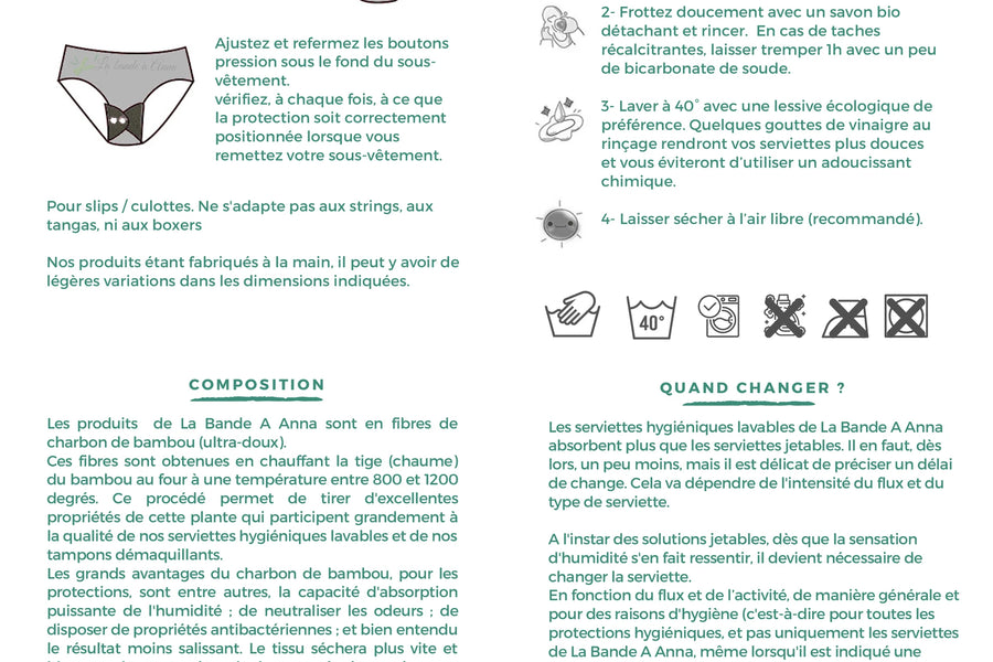Pour résumer, le côté en PUL doit être positionné dans le fond du slip et fixé avec les boutons pression, tandis que le côté en fibres de charbon de bambou doit être placé contre votre peau.