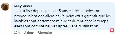 "J'en utilise depuis plus de 5 ans car les jetables me provoquaient des allergies. Je peux vous garantir que les lavables sont nettement mieux et durent dans le temps elles sont comme neuves après 5 ans d'utilisation."